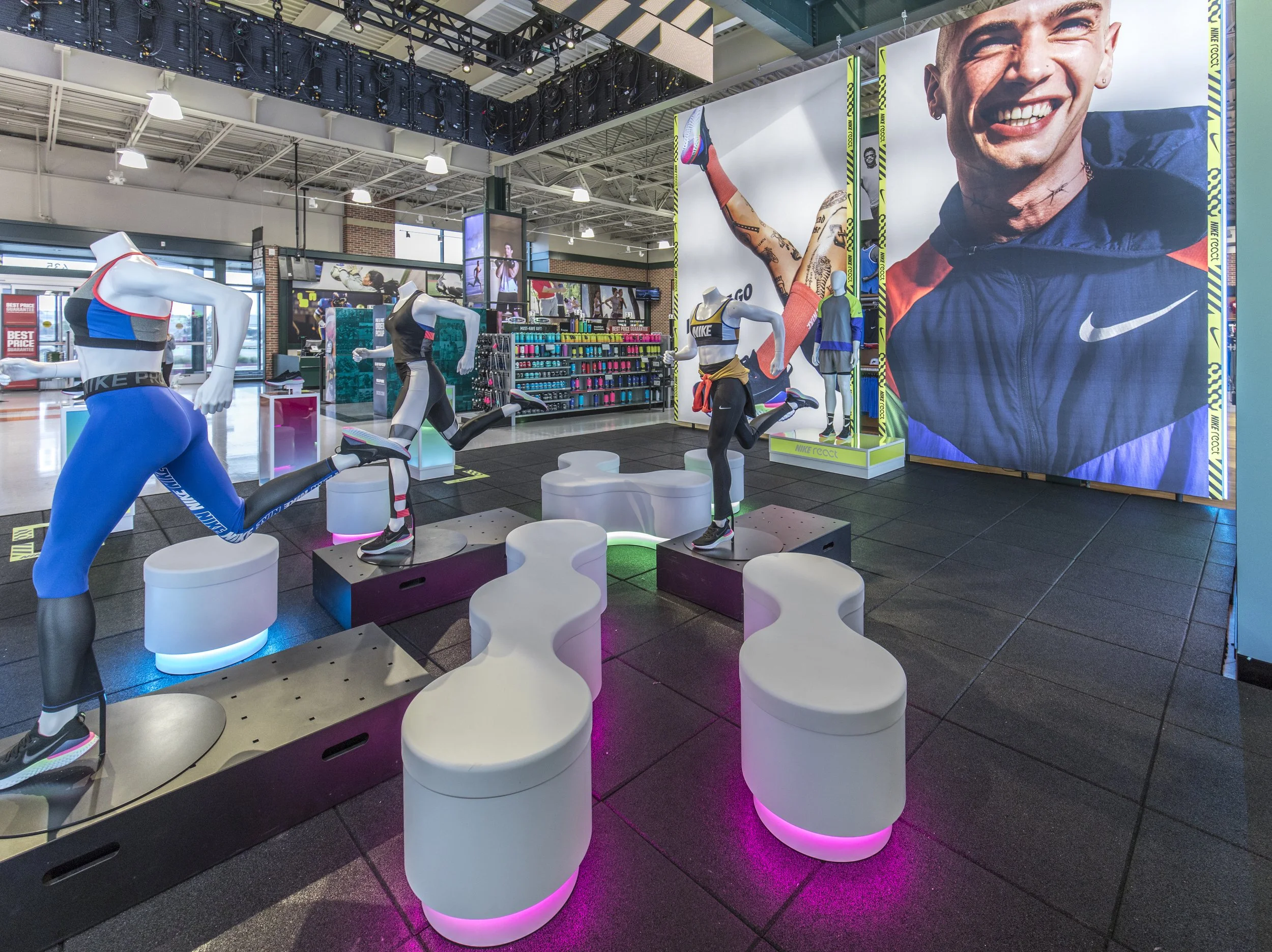 Illuminated benches mirror the geometry on the React outsole, and were fabricated using the same foam technology found in the shoe. This gives the space a sense of energy, and connected the colorful approach to lighting and graphics along the floor plane.